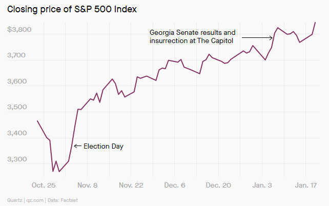 선거 후 초기 급등 이후 시장은 약간 냉각되었습니다. 일부 주에서 Covid-19 백신 및 신종 코로나 바이러스 관련 제한에 대한 우려로 인해 기대치가 낮았습니다. 1 월 초까지 투자자들은 이미 백신의 배포와 Biden 행정부가 기업에 대한 세금을 인상 할 가능성을 고려했고, 이는 비용에 영향을 미치고 2021 년에 대한 기대를 얻었습니다. 그리고 도널드 트럼프 대통령은 여전히 불확실성의 주요 원인이었습니다. 뉴욕에 본사를 둔 Kramer Capital Research의 최고 투자 책임자 인 Hilary Kramer는“그가 할 수있는 일과 떠나지 않을지에 대한 진정한 우려가있었습니다. 그러던 중 1 월 6 일 민주당 원이 조지아의 상원 의석을 모두 차지했고 트럼프 지지자들이 미국 국회 의사당 건물을 공격했으며 여러 공화당 원이 공화당 대통령에 대해 발언하여 트럼프가 계속해서 권력 이전을 방해 할 것이라는 투자자들의 우려를 줄였습니다. “아이러니하게도 1 월 6 일과 국회 의사당의 폭동은 상황을 정말로 바 꾸었습니다. 그리고 시장이 시작되었습니다.”라고 Kramer가 말했습니다.