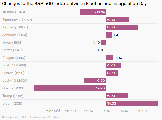 선거 이후 Joe Biden은 투자자들에게 희소식이었습니다. 11 월 3 일 선거일과 오늘 사이 S & P 500 지수는 14.3 % 상승했습니다. 뉴욕에있는 투자 리서치 회사 인 CFRA 리서치의 보고서에 따르면, 제 2 차 세계 대전 이후 모든 1 기 대통령의 선거와 취임식 사이에 이득이 가장 좋습니다.