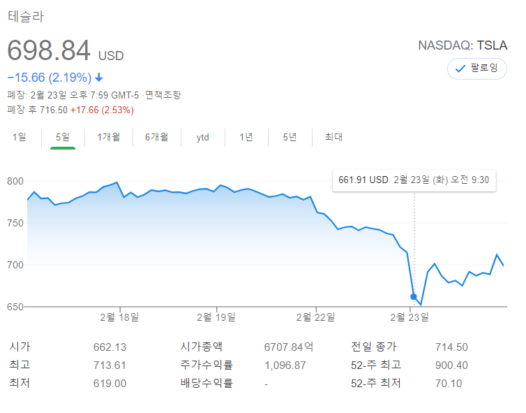 Tesla(TSLA) 프리마켓에서 낙폭 확대… 700달러 하회