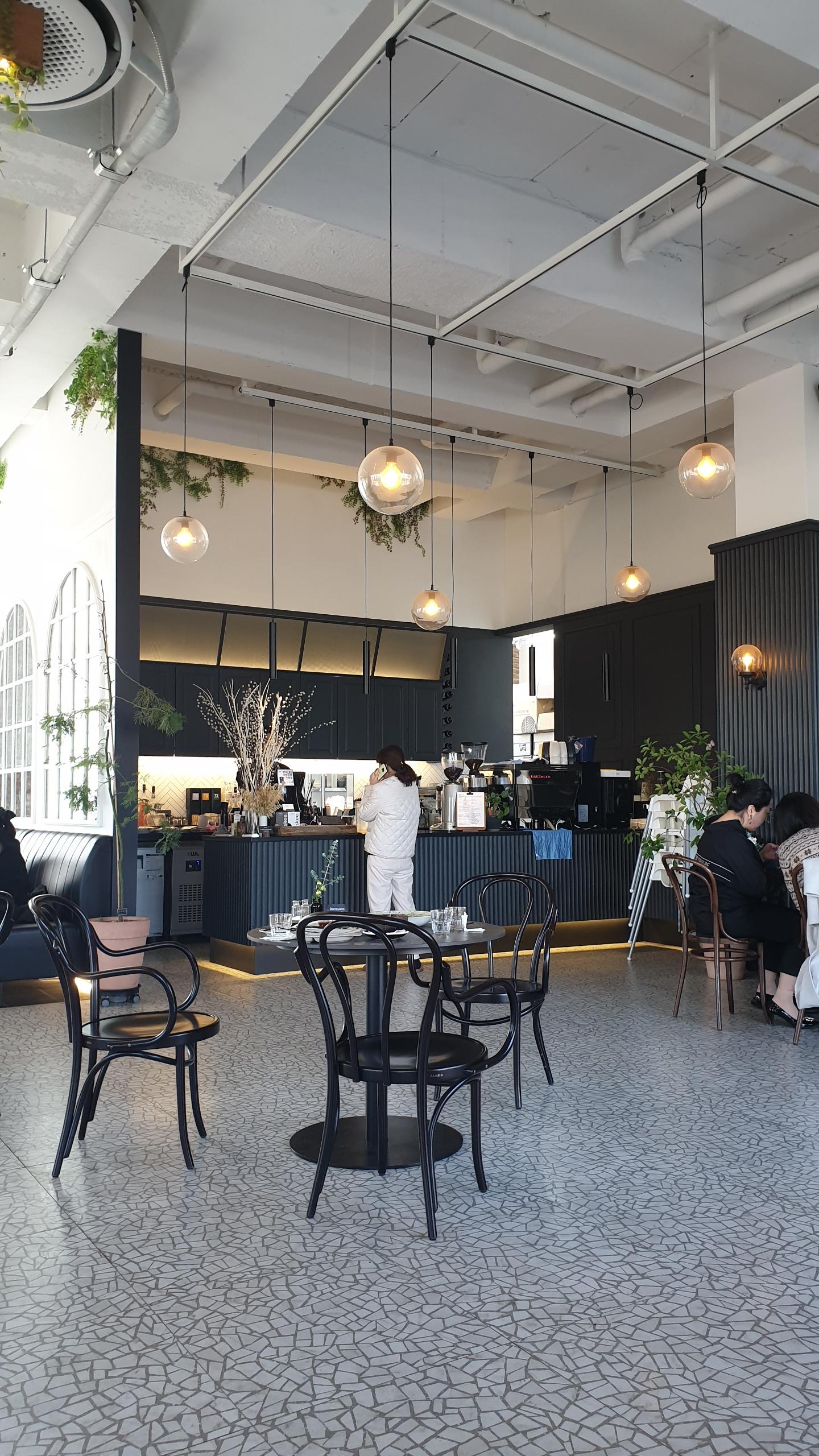 인스타 맛집 답게 층고는 높고 큼직큼직 시원한 그림, 화분들 ㅎㅎ 천장 행잉 플랜트도 예뻤다.