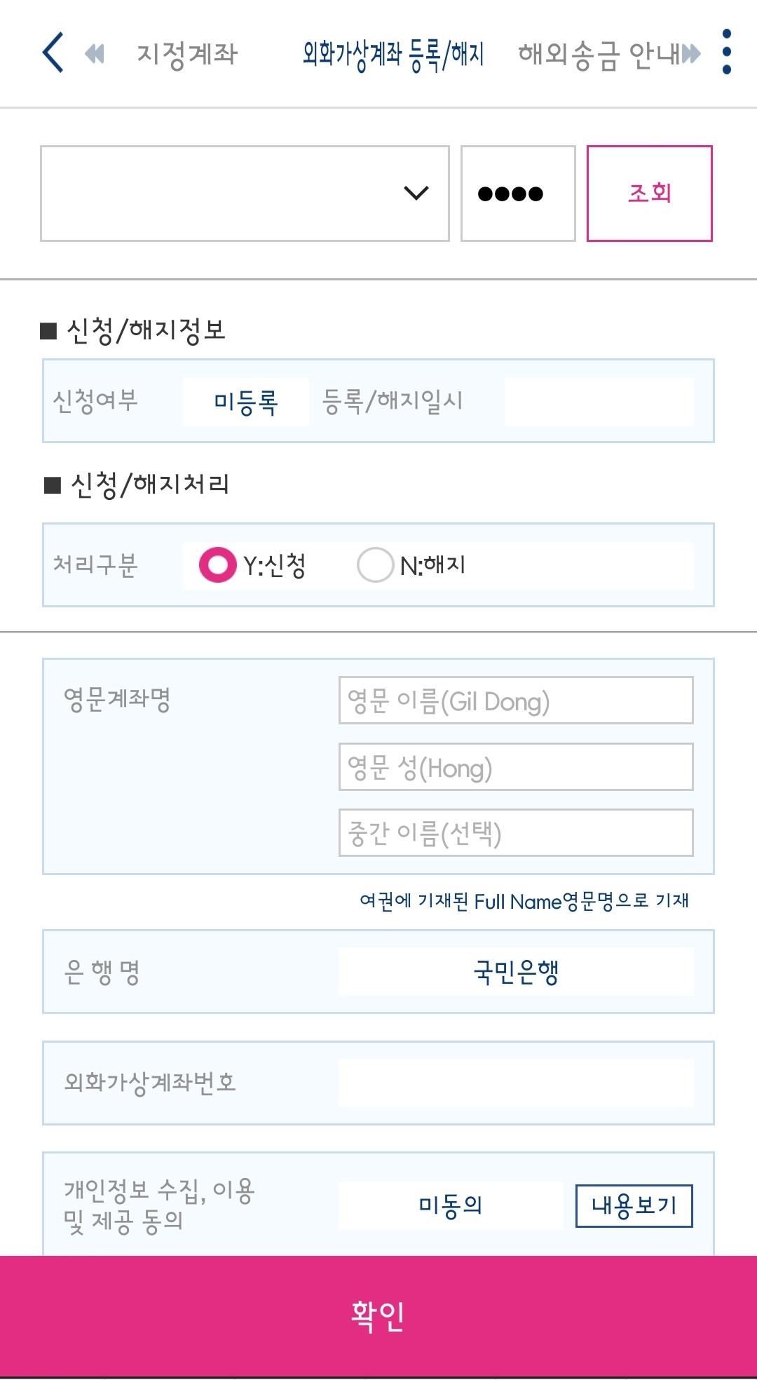 이 때 본인간 거래임이 확인 되어야 외화이체가 가능 합니다.