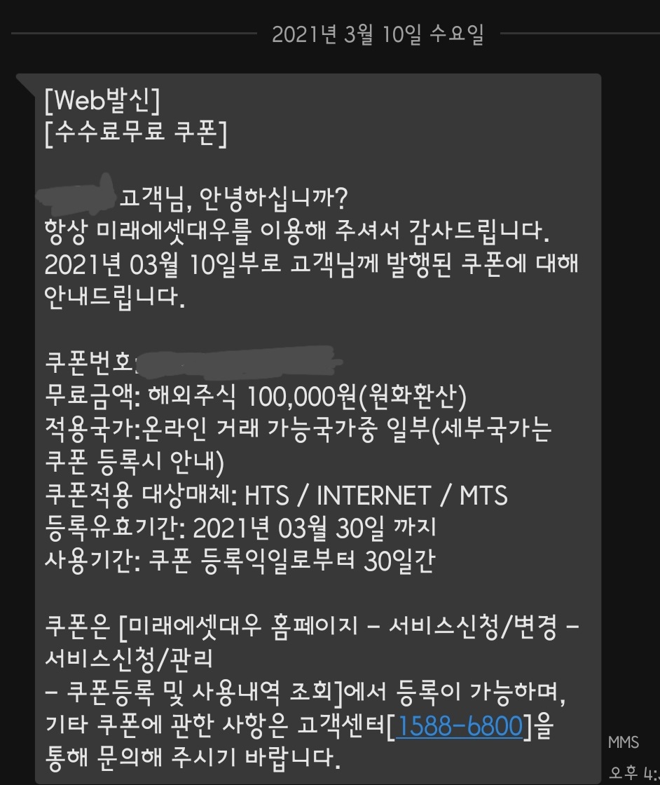 미래에셋증권에서는 잊을만하면 한번씩 수수료 쿠폰을 뿌린다.