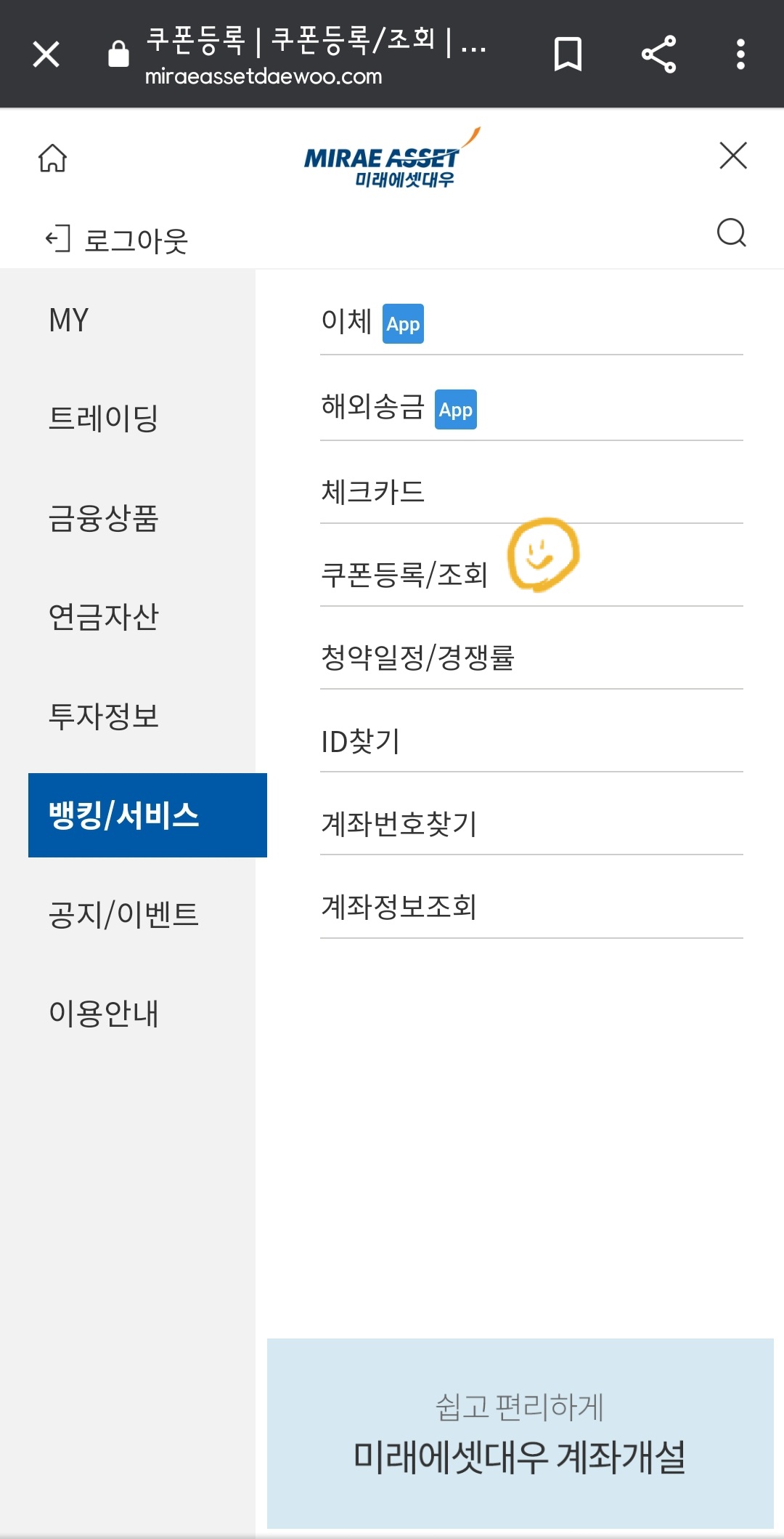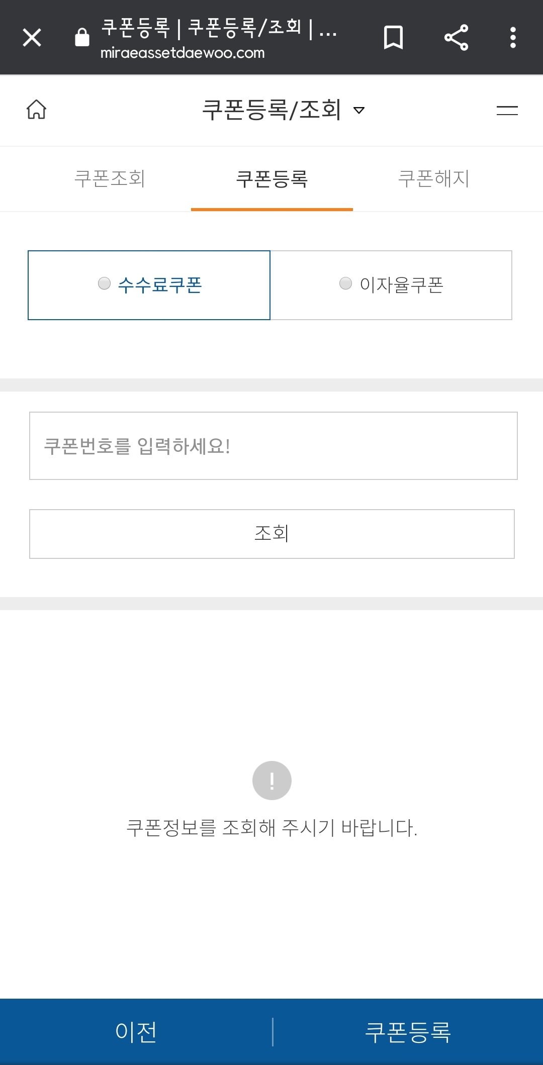 앱에서 쿠폰등록 메뉴를 찾아 헤매는 것은 소용없다. MTS 는 등록 불가 (여윽시 미래에셋)