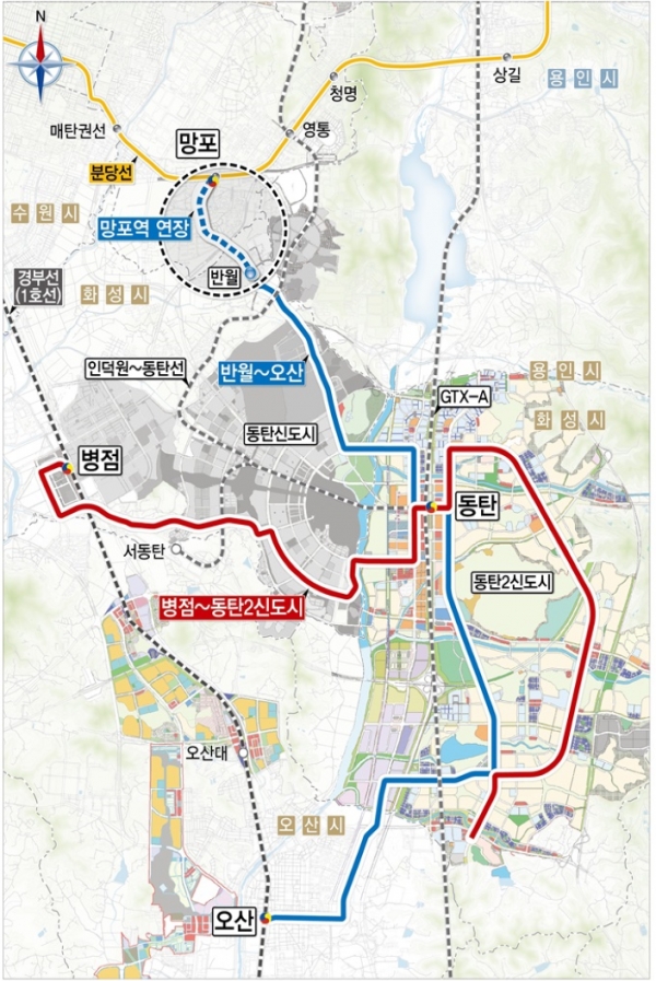 수원 망포역~동탄역~오산역, 병점역~동탄역~차량기지 2개 구간에 걸쳐 트램을 도입하는