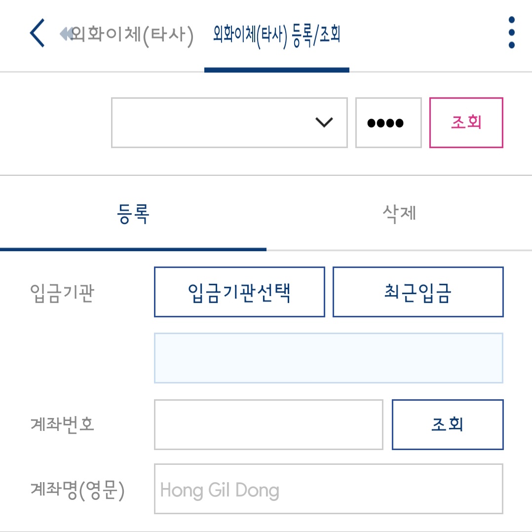* 모바일 영웅문SG : K메뉴 > 업무 > 입출금 > 외화이체(타사)등록/조회