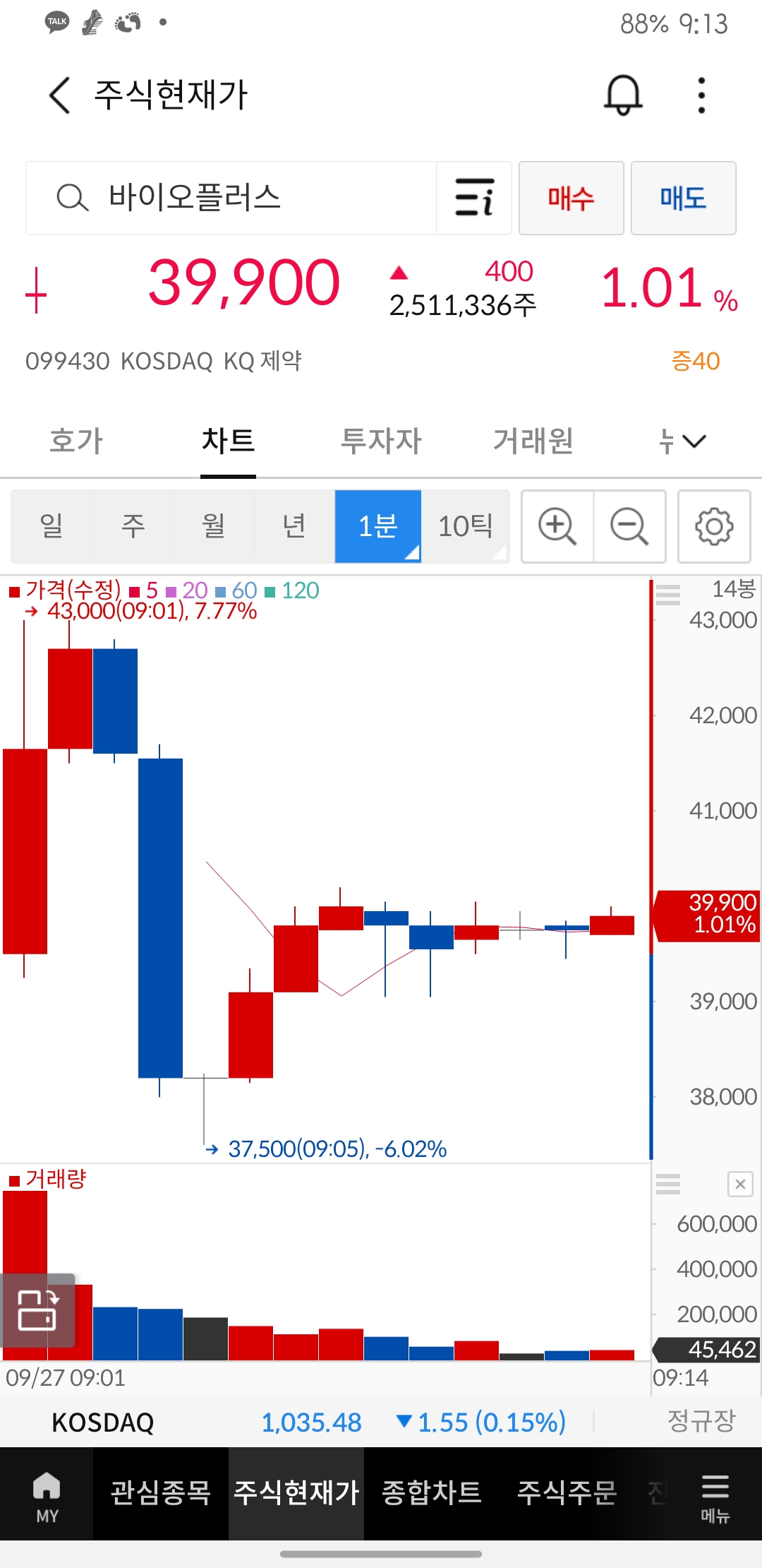 상장 당일 정신 없어 9시 10분에 겨우 들어갔다.