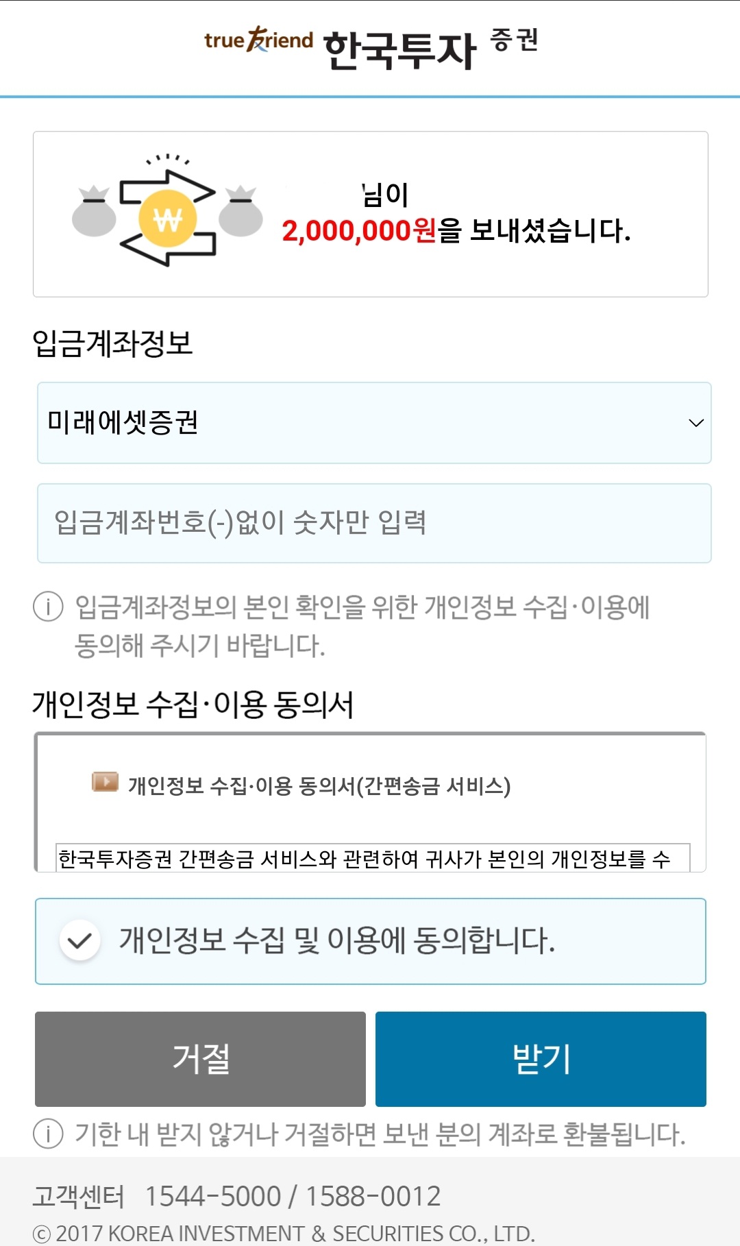 받는 사람의 휴대폰 번호로 송금하면