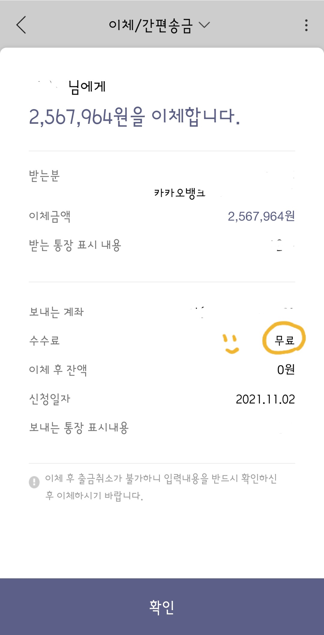 내 경우 카카오뱅크를 통해 한투 계좌를 뚫었기 때문에 카카오뱅크 연계계좌로 송금 시 수수료가 무료다.