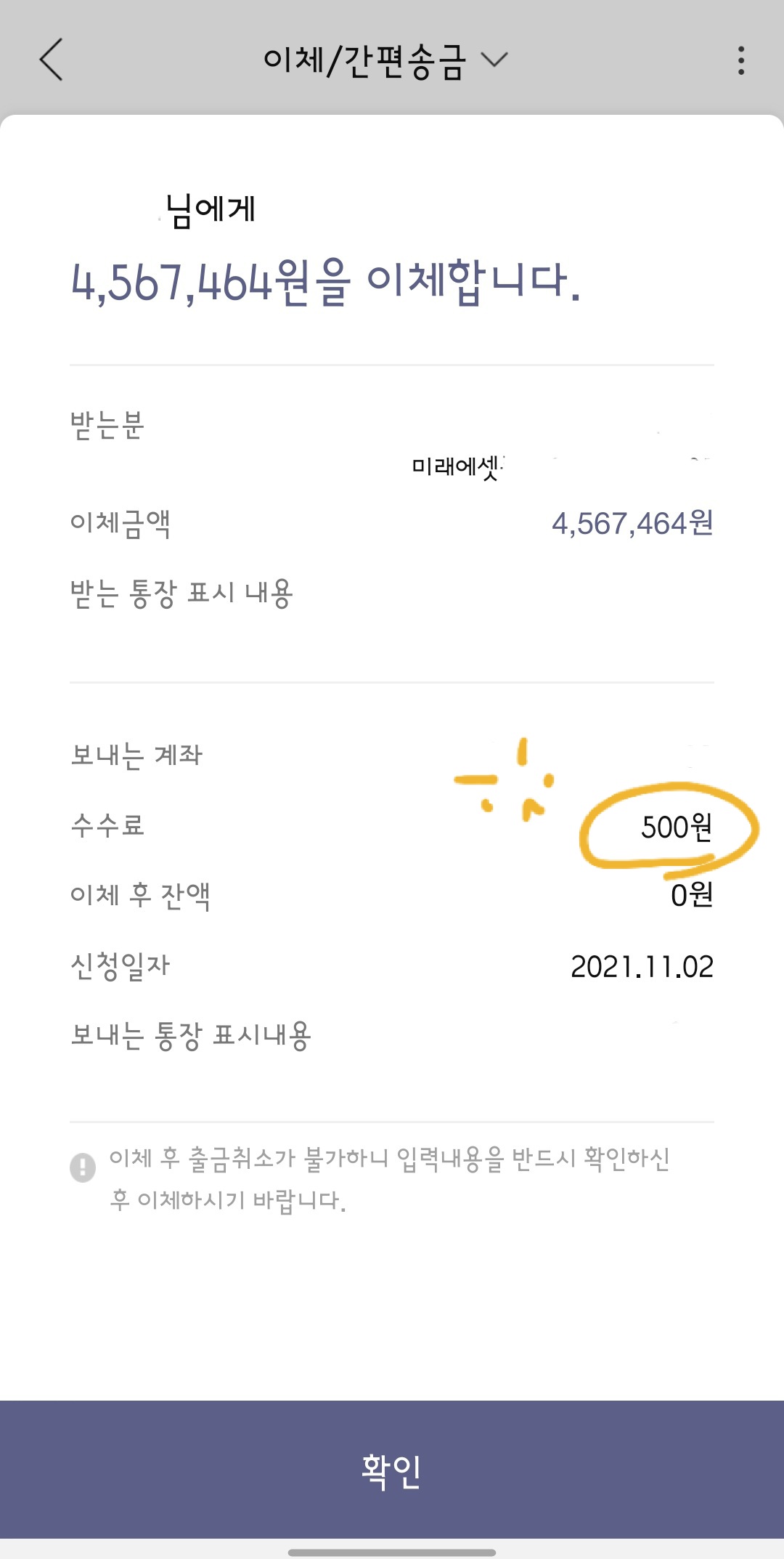 한투 디어유 공모주 청약 후 잔액을 송금하려니 수수료가 500원이 든다
